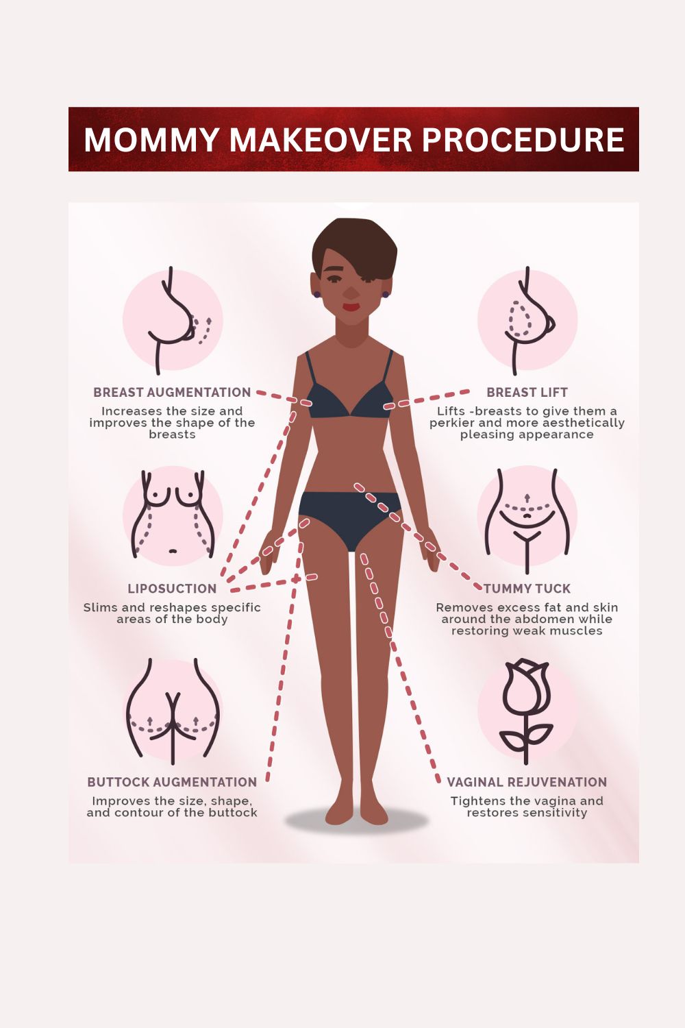 A mommy makeover is not a single procedure but a customized surgical plan tailored to the patient’s needs. The treatment typically focuses on restoring the abdomen, breasts, and overall body contour. Common procedures included in a mommy makeover are tummy tuck, breast lift or augmentation, and liposuction.